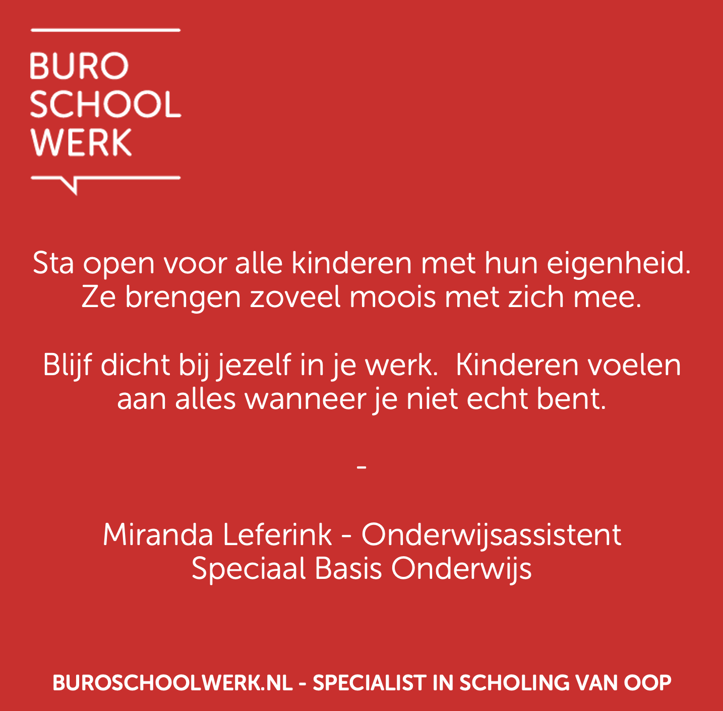 Ik ben Miranda en ben onderwijsassistent in het SBO. Ik werk in groep 1/2 met 14 kinderen, allemaal met een eigen verhaal.