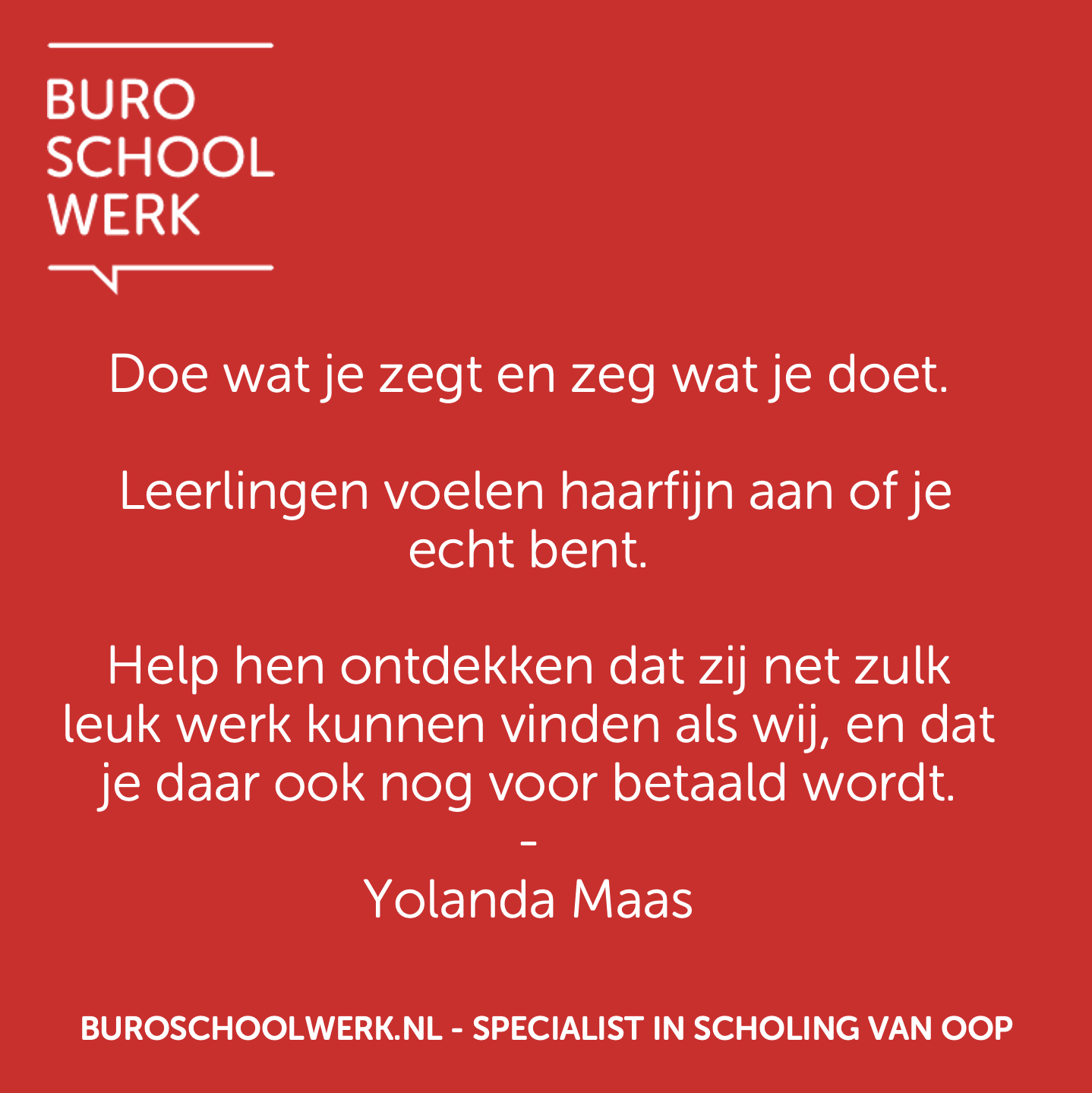 Mijn tip voor andere OOP’ers: Doe wat je zegt en zeg wat je doet. Leerlingen voelen haarfijn aan of je echt bent. Help hen ontdekken dat zij net zulk leuk werk kunnen vinden als wij, en dat je daar ook nog voor betaald wordt.